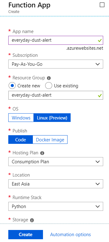하나의 앱은 여러개의 Function으로 구성되며, 각 Function은 각각 하나의 기능을 담당한다. 예를 들어, Azure Function을 웹훅 용도로 사용한다면 여러개의 API를 서로 다른 Function으로 구성하게 된다. 우리는 정기적으로 미세먼지 알림을 보내는 한 가지 기능만 필요하므로 하나의 Function이면 충분하다.
