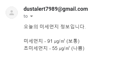 매일 아침 미세먼지 정보를 읽어들여 미세먼지 농도가 높을 경우 메일로 주의 메세지를 보내는 앱